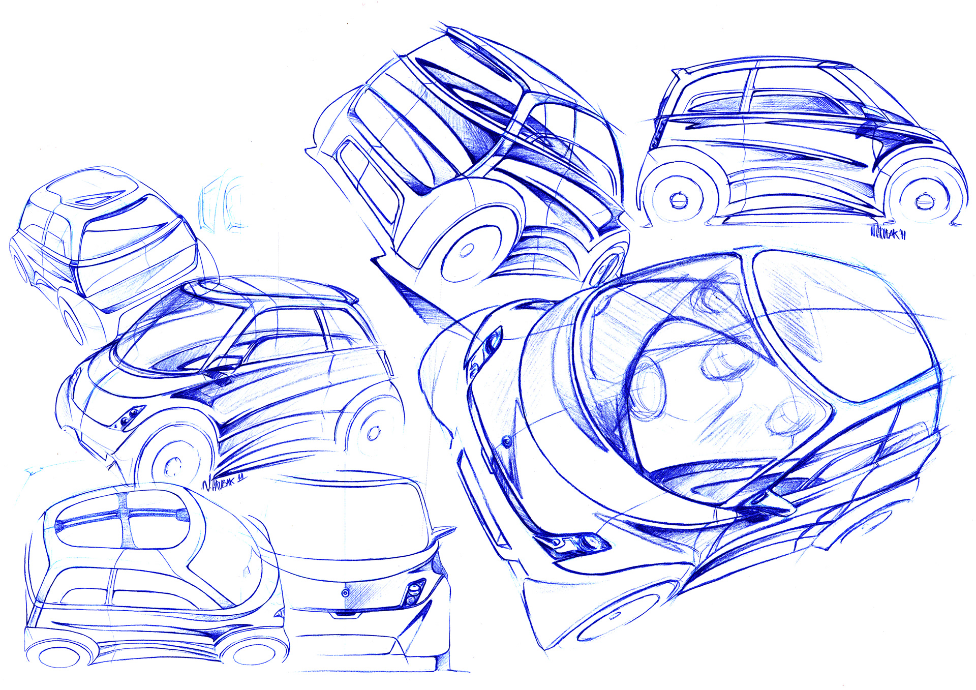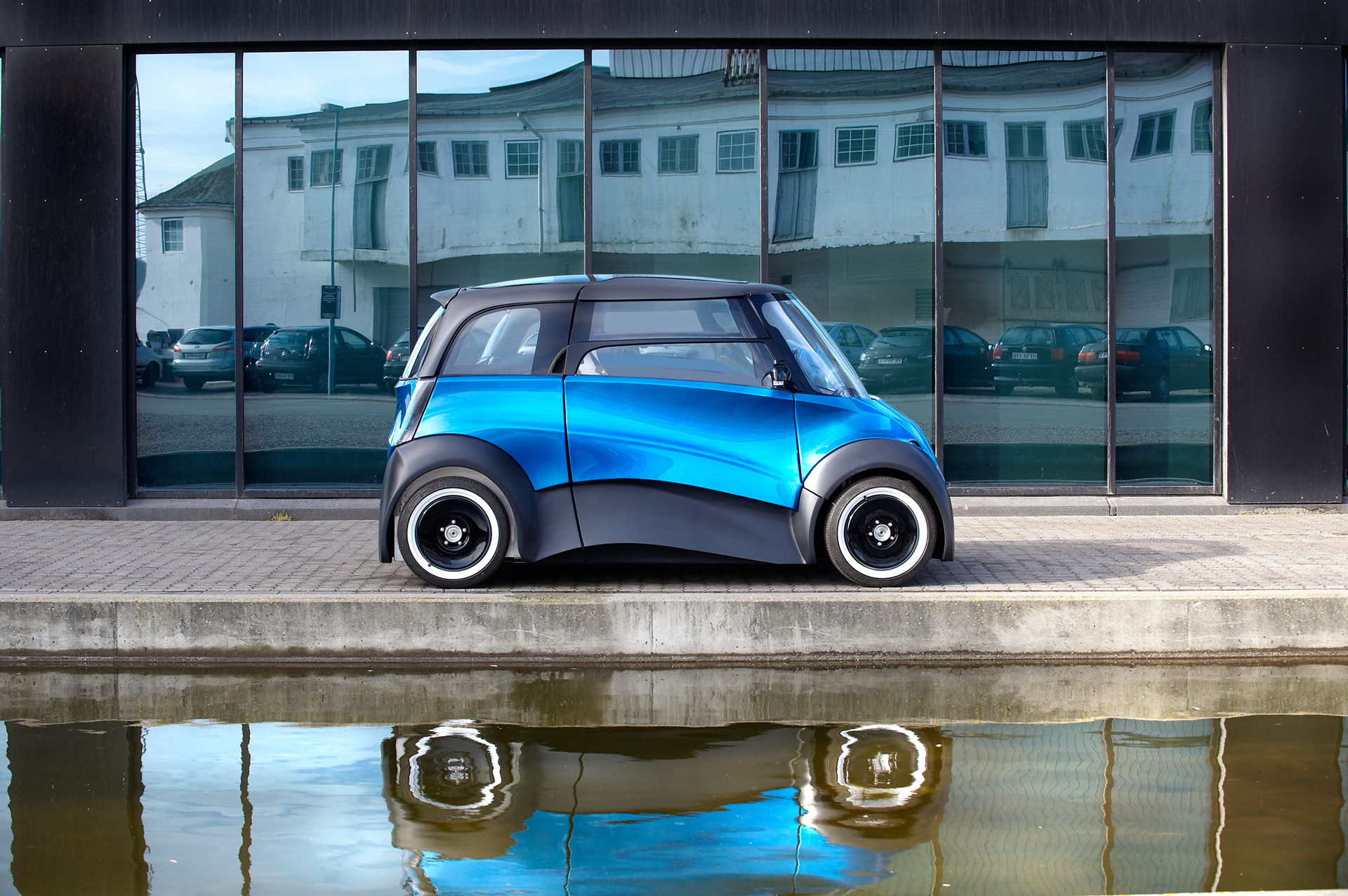 On the outside the car is designed to look robust and signal safety. The bulky wheel arches enhances the wheels, and is underlining that the power comes from the in-wheel motors. To create a strong identity and give the very short car direction the overall lines runs from front to rear. Design language is a blend of concave and convex surfaces to create dynamic reflections as the car moves through the city.
